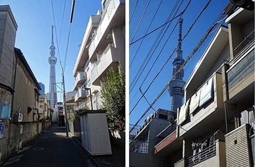 込み入った路地を進む。僅かな隙間からも東京スカイツリーは見える。