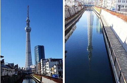 墨田観光協会のホームページには「タワーの足元を流れる北十間川は、墨田区の中央部を旧中川から隅田川まで横断している区内で一番狭い川です。川沿いから見ると大迫力! あまりの高さに、見上げている首が疲れてしまうので気を付けて下さい」と書いてある。