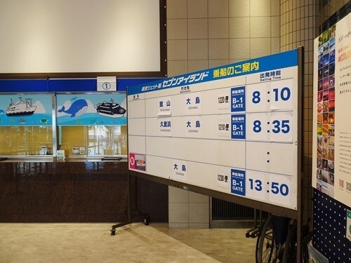 出港案内板を見たら、今日の大島行きの船は午前8時35分に出ていて、次は午後1時50分だった。だから誰もいないのだった。