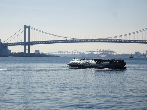 レインボーブリッジの手前を定期観光船「卑弥呼」が行く。