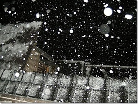 部屋から覗き見た「テラス風呂」(左)。夜半から雪が強くなって来た。