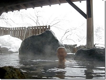 大風呂、テラス風呂、露天風呂の3種類の風呂があるので、その全てを試す。お湯は硫黄泉で透明である。雪を見ながらの入浴は至福の時であった。