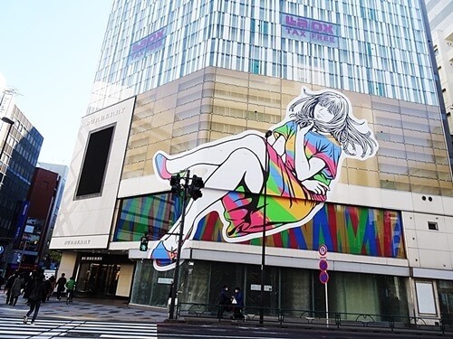 信号機の向かい側のビルに、巨大なアニメ風のアートが描かれていた。私はこれは初めて見た。アートの斜め向かい伊勢丹で、この辺りでは威容を誇っている。