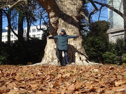 細い道を進むと、巨木がたくさんある。巨木さが分かるように、記念撮影をした。