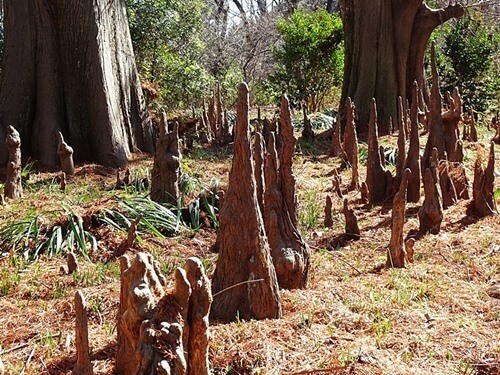 『秋になると枝が鳥の羽のように落葉することから、落羽松といいます。地面にゴツゴツとタケノコのように並んでいるのは「気根」といって、ラクウショウの根から出ているものです』