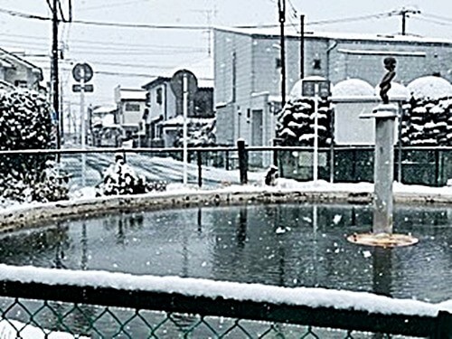 『こちらの雪の深さは約5cmです。写真は都内に7ケ所しかない「ションベン小僧」のある防火用水の雪景色です。宅のすぐ側にあります。TV東京の番組(空からみた東京?)に取り上げられて一躍有名になりました。日野自動車の社宅にある防火用水ですが、昔は夏には子供用のプールになりました』