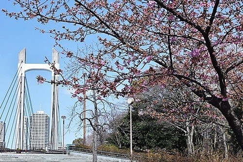 そこが木場公園の中間で、道路を跨ぐ大きな木場公園大橋が目立つようにそびえ立っている。橋の手前にたった1本の河津桜があったが、まだ2分咲きくらいだった。