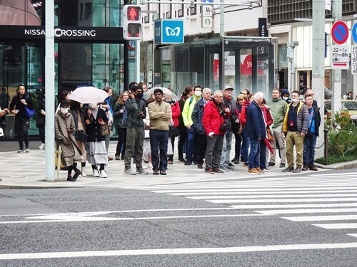 銀座4丁目交差点では、外国人はほとんどマスクをしていない。