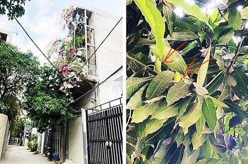ハンさんの工場脇に植えたマンゴーと、2個なったマンゴーの実。