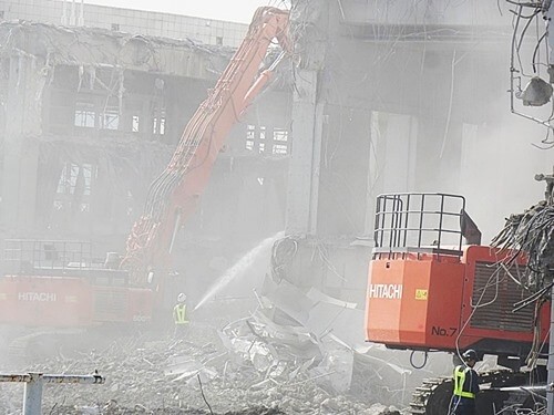 そして現在は解体控除の真っ最中である。壊すのは簡単だ。大型重機が何台もで、埃を巻き上げながら壊している。埃の中にホースで水を掛ける人が見える。解体後は何が出来るのだろう?