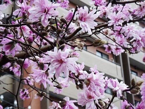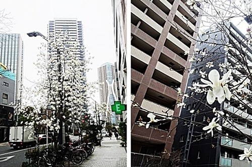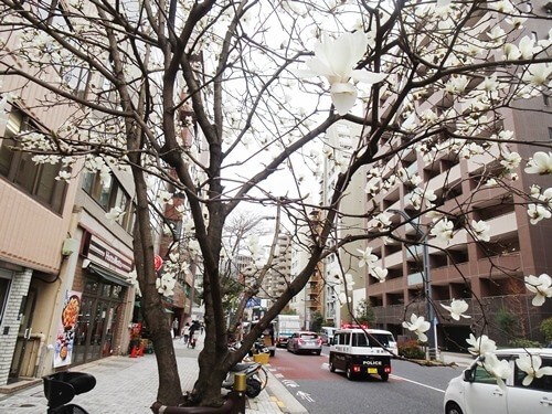 東京の開花宣言は靖国神社の標準木で観察するが、例年より早く14日に開花宣言が出された。染井吉野が咲く前に、街路樹として植えられた「モクレン」が咲いているのを見掛けるようになった。