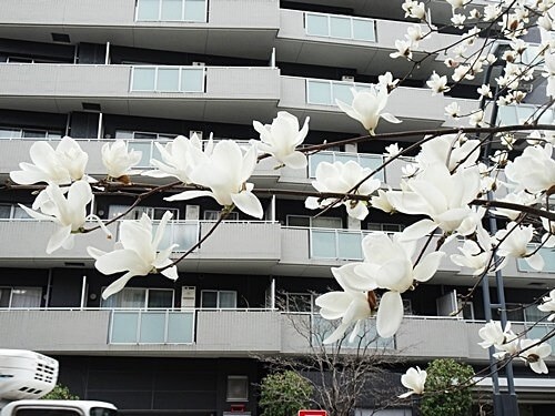 そしてマンションに着いたら、道路沿いに「モクレン」の街路樹が植えられていて、いまは少し見頃を過ぎていた。ここにハクモクレンがあるのを、注意力散漫でいまになって知った。
