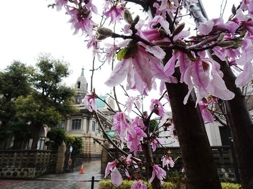 築地本願寺の裏門を出ると、ピンクのモクレンの街路樹がある。