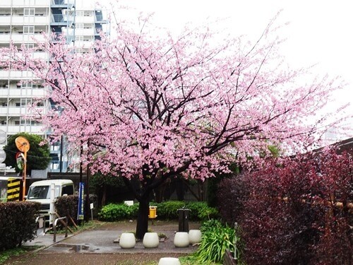 隅田川の川沿いを歩いて勝鬨橋まで行って、橋を渡り反対側のテラスに降りて築地大橋方面に進む。その先の小さな公園を出て少し進むと、この辺りで一番早い桜が咲いている。