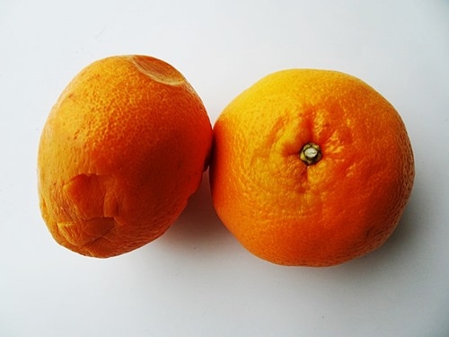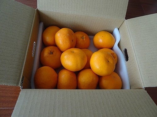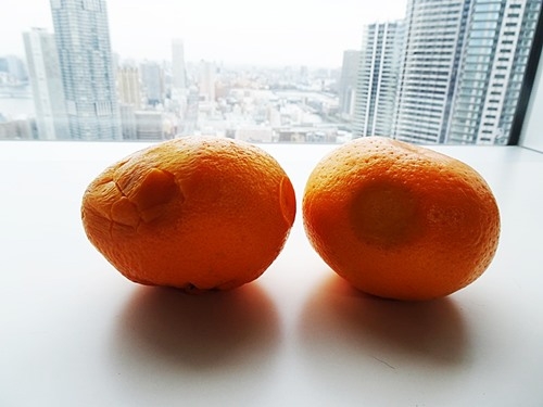 2日後に届いた箱を開けたら、いま我が家にあるものよりも大粒の「はるみ」が14個も入っていた。「訳アリ」の場合は大小が混在していたり、少し形が悪かったりするのだが、そんなことは無かった。ところが箱から出してみたら、3個が痛んでいた。