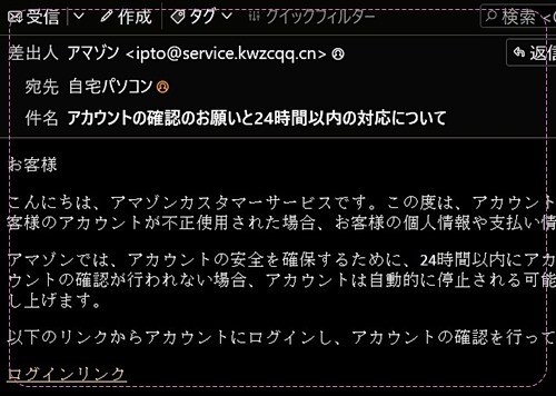 URLを見たら、「ipto@service.kwzcqq.CN」と書いてあった。CNは中国だから、中国人の詐欺師からだった。