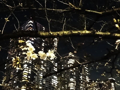 桜の花は並木の2~3本の木に、2~3輪だけ咲いていた。たまには家族で、夜の散歩もいいものだ。