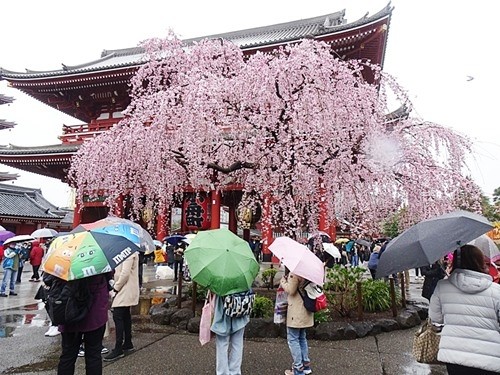 「宝蔵門」に差し掛かると右手に美しい1本の枝垂れ桜があり、みんなはそこで記念撮影である。
