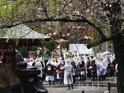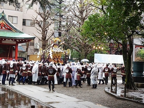 担ぎ手はマスクでビニールのレインコートを着ていて、浅草神社の境内だけで巡行している。