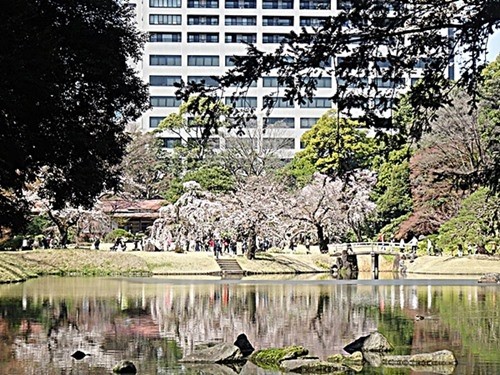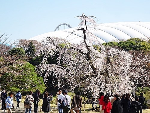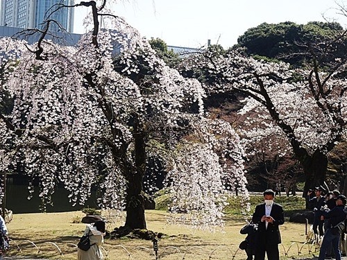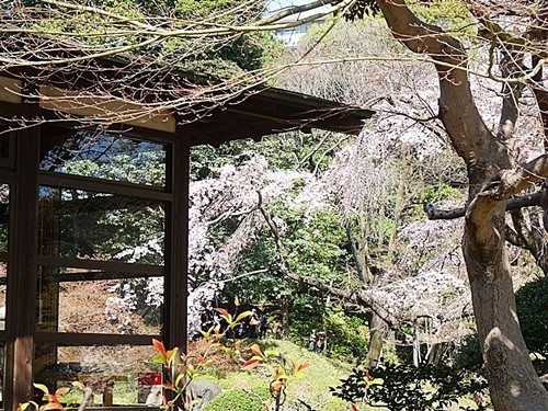 この庭園は「枝垂れ桜」が多いので、ソメイヨシノより早く咲き今は満開である。