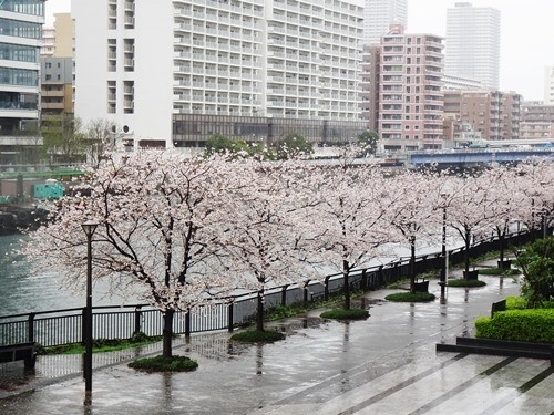 我が家の窓からトリトンスクエアが見えたのに、その途中にタワーマンションが建設中で見えなくなった。トリトンスクエアの前に流れるのは「朝潮運河」で、そこには桜の木が植えられている。