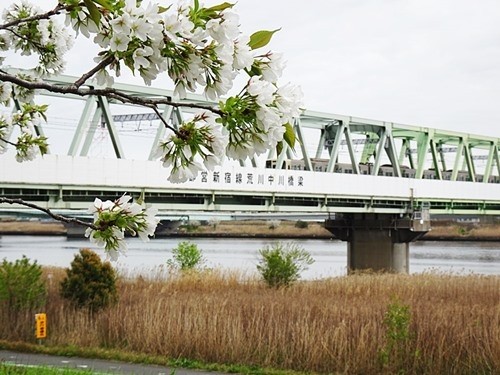 「東大島駅」を降りると、駅前から桜が満開である。船堀駅前でも感じたが、江戸川区は桜が多い。小松川千本桜は駅から2~3分で、荒川に面している。