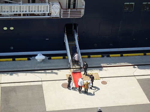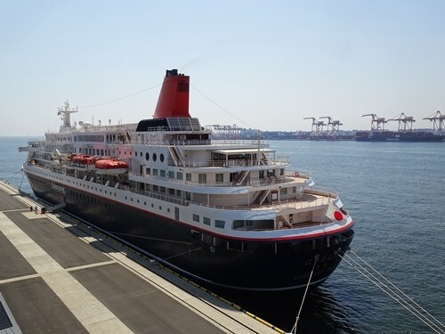 なんとか「東京国際クルーズターミナル駅」に辿り着き、そこから歩いてターミナルへ行った。この日は豪華クルーズ船の「にっぽん丸」が13時30分に出航予定となっていた。ターミナル4階の送迎テラスに出て、「にっぽん丸」の写真を撮った。