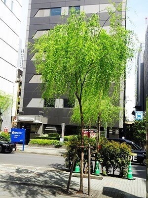 銀座2丁目に来て、やっと柳に出会った。柳の木が新緑に染まっていた。