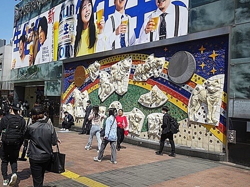 本人達は気がついていないが、遠くから見ると面白い絵なので、思わず写真を撮ってしまった。駅に入る手前の壁に、巨大なレリーフ「ハチ公ファミリー」があった。