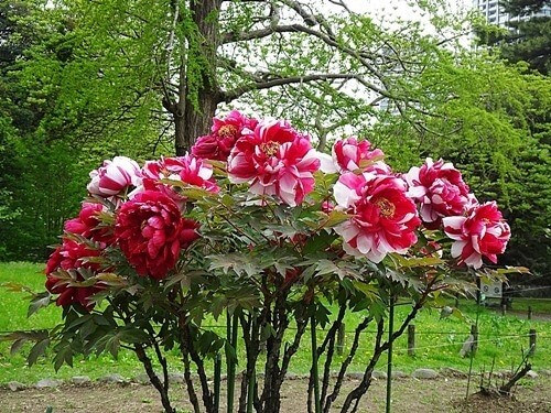 「牡丹園」には60種、800株の牡丹が植えられている。赤と白の混ざった牡丹は華やかだ。
