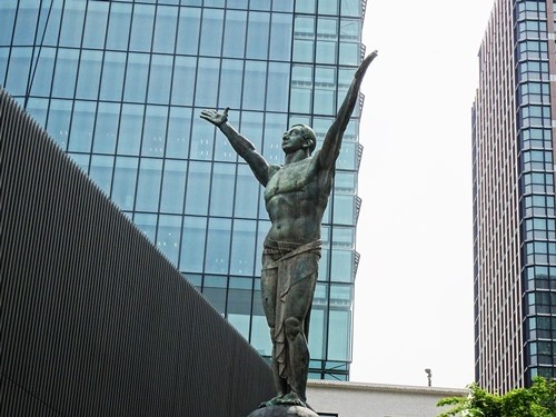 バス停の後ろに、両手を広げて立つ男性の銅像がある。