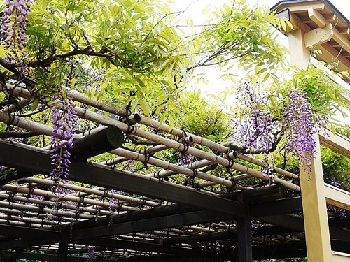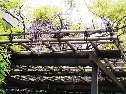 住吉神社に入ると、小さな藤棚がある。見上げると藤の花は、ほぼ満開だった。