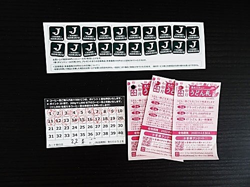 コーヒー豆は1000円でハンコが1つ。パン屋は500円でシールが1枚。うどん屋は店によって、サービス券が1枚。ネットで買い物をすると、よく分からないが1%くらいのポイントか?