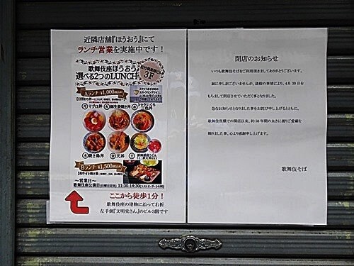 「改装中のため休店」の貼り紙のあった「歌舞伎そば」の改装が終り、「そろそろ開店かな?」と思い出掛けて行った。店の前に行くと、また違う貼り紙があった。