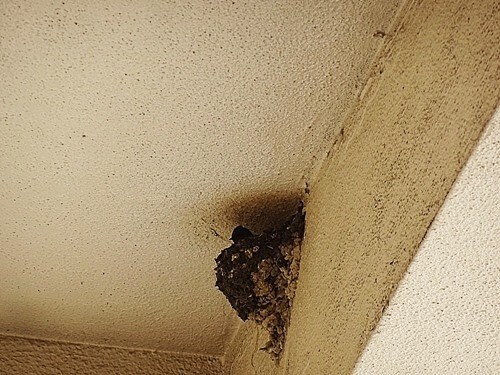 昨年は巣が2ヶ所にあったが、今年は1ヵ所だけだった。無くなった1ヵ所はお客様の出入りの際に上から糞が落ちて来る恐れがあり、撤去したのかもしれない。下から見上げると天井の角に小さな巣があり、親鳥が卵を温めているのかジッとしている姿が見えた。銀座の自然の一コマだった。