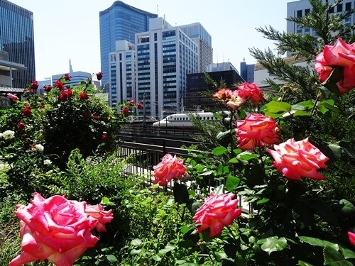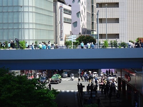 「どこか見える場所はないか?」と考えて、東京交通会館の3階ガーデンを思い付いた。スカイウォークを遠くから見たが、係員ばかりで参加者は少なかった。