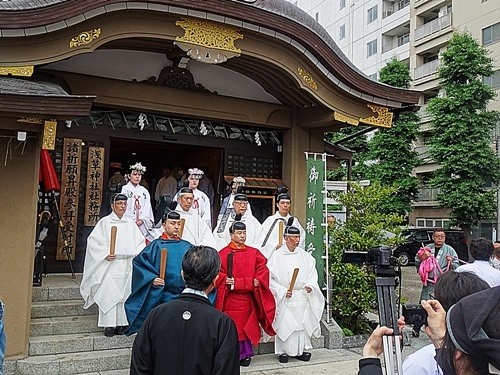 お祓いを受けた神輿が浅草神社から出て来た。