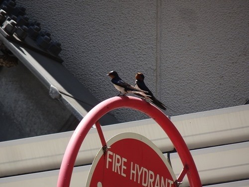 どうやらツバメは巣に戻りたいのに、私がいるから戻れないのではないかと気が付いた。巣の向かい側の消火栓のポールの頂上に留まって、こちらの様子を見ている。