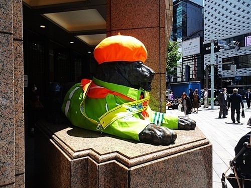 日本橋三越本店には左右に2頭のライオンがいるが、そちらのライオンが服を着せられたのを見たことが無い。5月11日から20日まで、全国交通安全週間なので、銀座のライオンも協力させられていた。