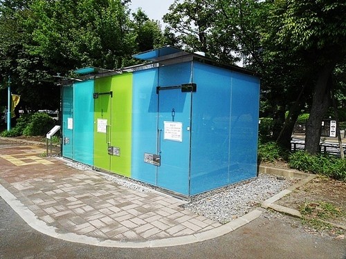 場所は千代田線の「代々木公園駅」を出たところにある、「深町小公園」と、その少し先にある「はるのおがわコミュニティ・パーク」の2ヶ所である。目指す透明トイレは、公園の入口の片隅にひっそりと変らずにあった。