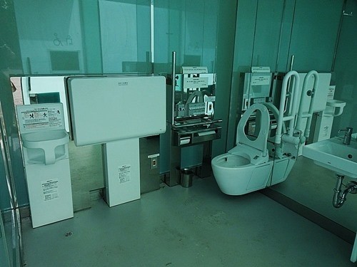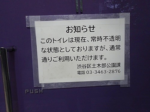 トイレに入口には貼紙があり、『このトイレは現在、常時不透明な状態としておりますが、通常通りご利用いただけます』と書いてあった。こんな素晴らしいアイデアのトイレなのに、気温が低くなると作動しなくなるとは残念だ。私には技術的に解決できない問題とは思えず、なんとかして欲しい。