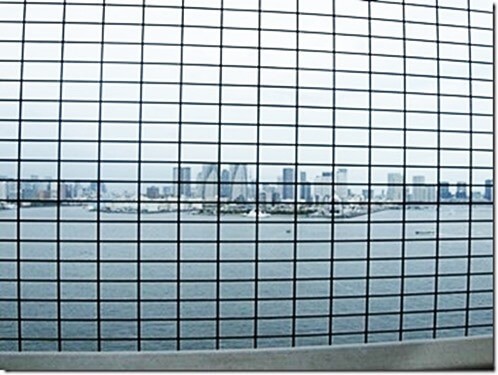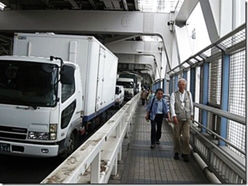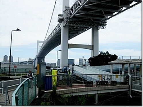 「エー!」と思ったが、今さらどうしようもない。レインボーブリッジに登る塔の入口に着いたら係官がいて、「今日は交通事故のため歩けません」と言う。