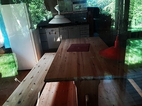 窓から見た「桜の家」の室内(キッチンと食堂テーブル)