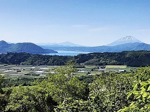 そこから少し上に上がった場所からの写真もあったが、そこからIさんの農園と販売所、洞爺湖、その向こうに羊蹄山も写っていた。