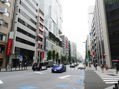 交差点の向こう側は5丁目で、角には1階がNISSANのショールームになっている「GINZA PLACE」があり。反対側は「三愛ドリームセンター」である。三愛ドリームセンターは、建て替え中の為、いまは閉鎖されている。