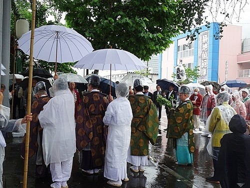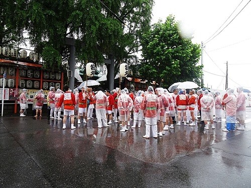 遠くに祭の法被の上にビニール合羽を着た集団が見えた。