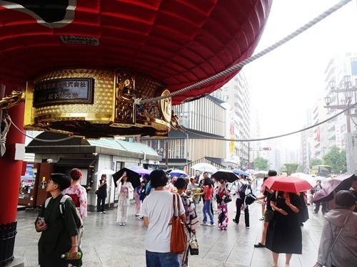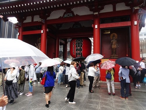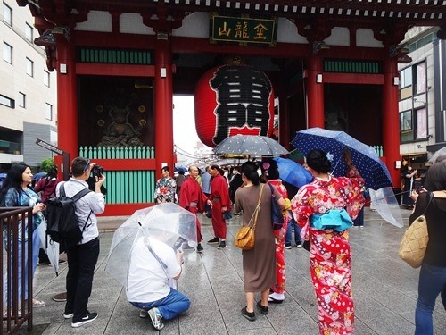 雨の中を大勢の外国人観光客が来ていて、雷門を背景に記念撮影をしていた。