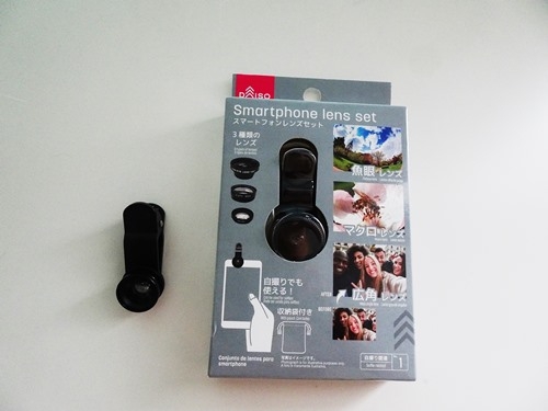 私が『100均に行くと、110円でスマホ用の接写・魚眼・高角の3種類のレンズが付いたものを売っている』と教えてあげた。
