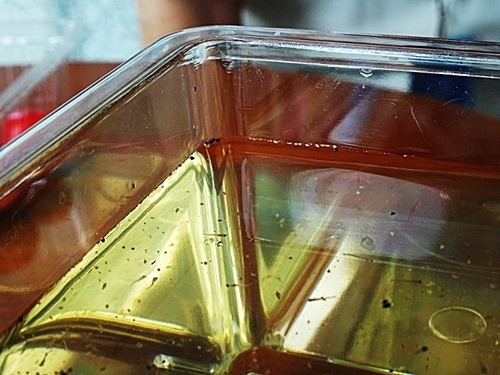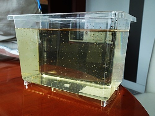 ガラスケースの中には餌のミジンコとメダカがいた。