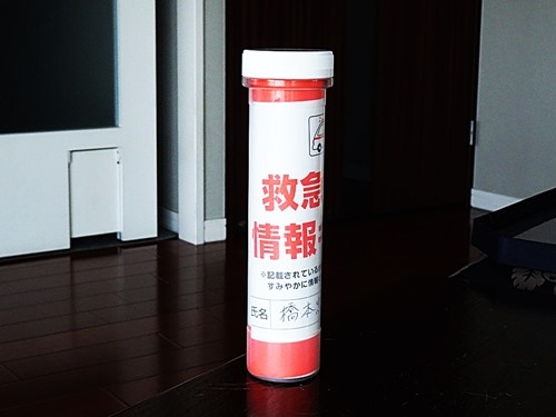 これは急病になったりして救急車を呼んだ時に、当人の情報が分かるように入っている筒である。住所、氏名、生年月日、年齢、血液型、健康保険証の写し、掛かり付け医、持病などを専用用紙に書いて入れておく。